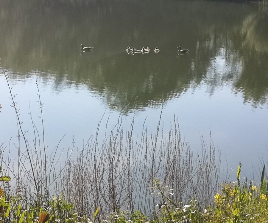 I took a detour and there were the goslings, much more grown up, motionless on mirrored water. So still were they, that I assumed they were asleep, but then a parent dipped her beak and very slowly rotated to face her brood. The sun was behind, low, and I saw a drop dripping off. Mid way, it sparkled as the light shone through it, refracting into a star as it fell. Without actively moving she sailed closer to them, the space narrowing, and then she nudged the nearest chick.