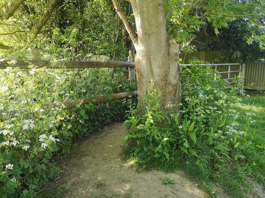 Crossing Vicarage Lane at a slight angle, I clambered over the stile, sleeve pulled down over my supporting hand to avoid skin contact, tromped through the grass, crossed an access road, and followed the footpath signs (you do not have the Right to Roam in England as we do in Scotland).
