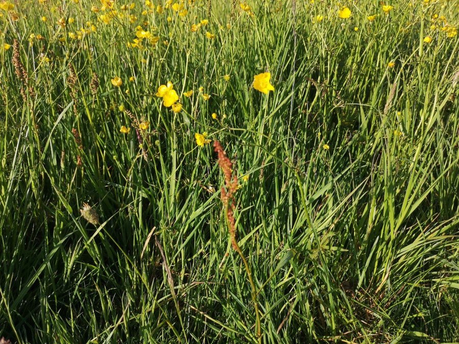 Common sorrel (Rumex acetosa) or ‘Sour Ducks’, red-brown between the buttercups