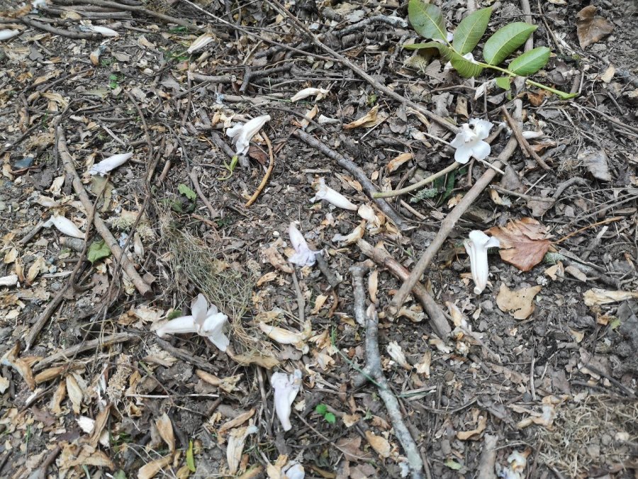 I stood under an unknown tree admiring its flowers. I flipped through my mental filing system, took a photo, and then the tree seemed to go ‘here you are’ and one white trumpet floated to the ground. There it lay amongst 10s of others! I picked one up (again, I didn’t even notice this touch until I started writing this) and carried it uphill. After some time I relegated it to my pocket for later perusal and it was, ooh, 5 minutes before I worked out what had caused the stickiness in my palm.