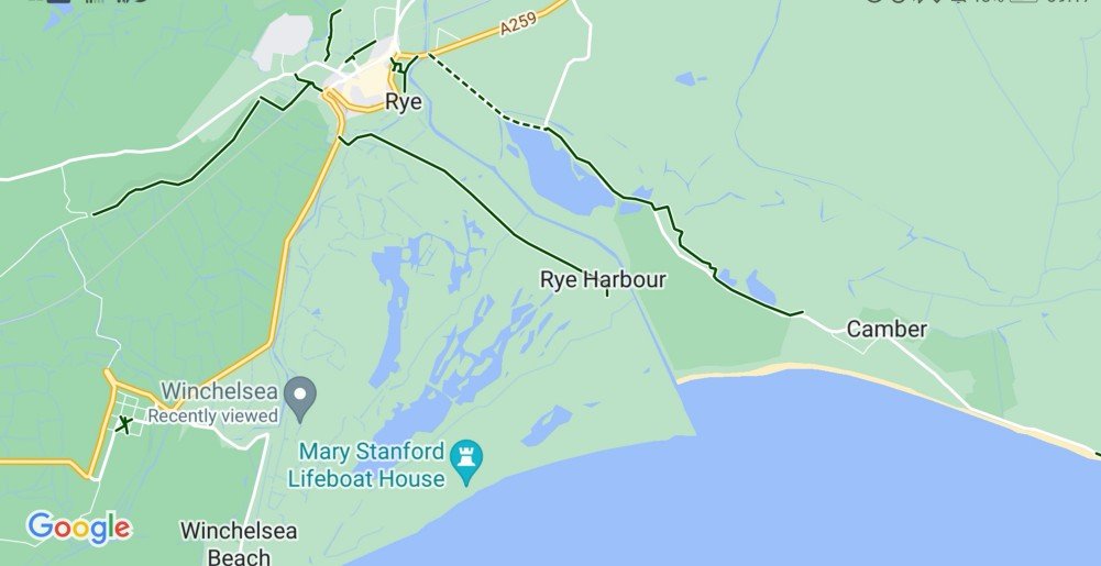 Taking the cross-country route from Winchelsea between the yellow and white roads above, through Rye, then from Rye Harbour to Camber Sands