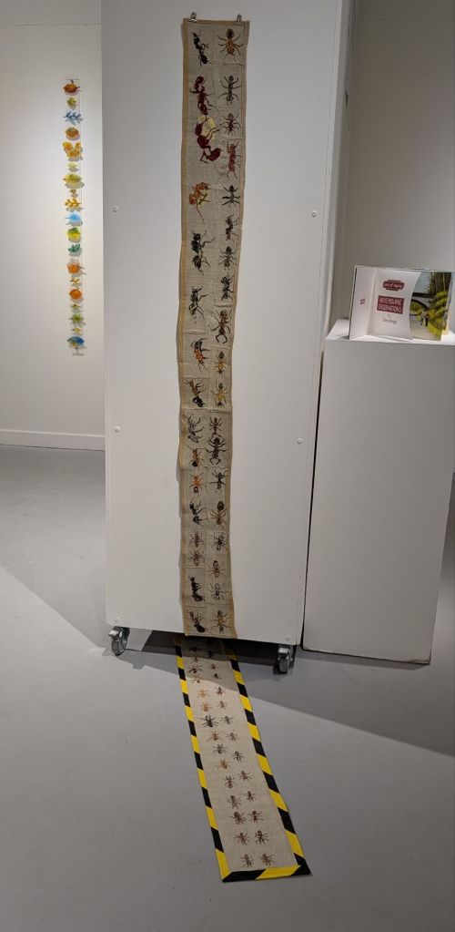 The Honeydew Line (stitching) by Tamsin Grainger at the Hardwick Gallery, Cheltenham. Ants walk each day to forage, and like commuters along the Honeybourne Line (Cheltenham), they pass in both directions often carrying heavy loads