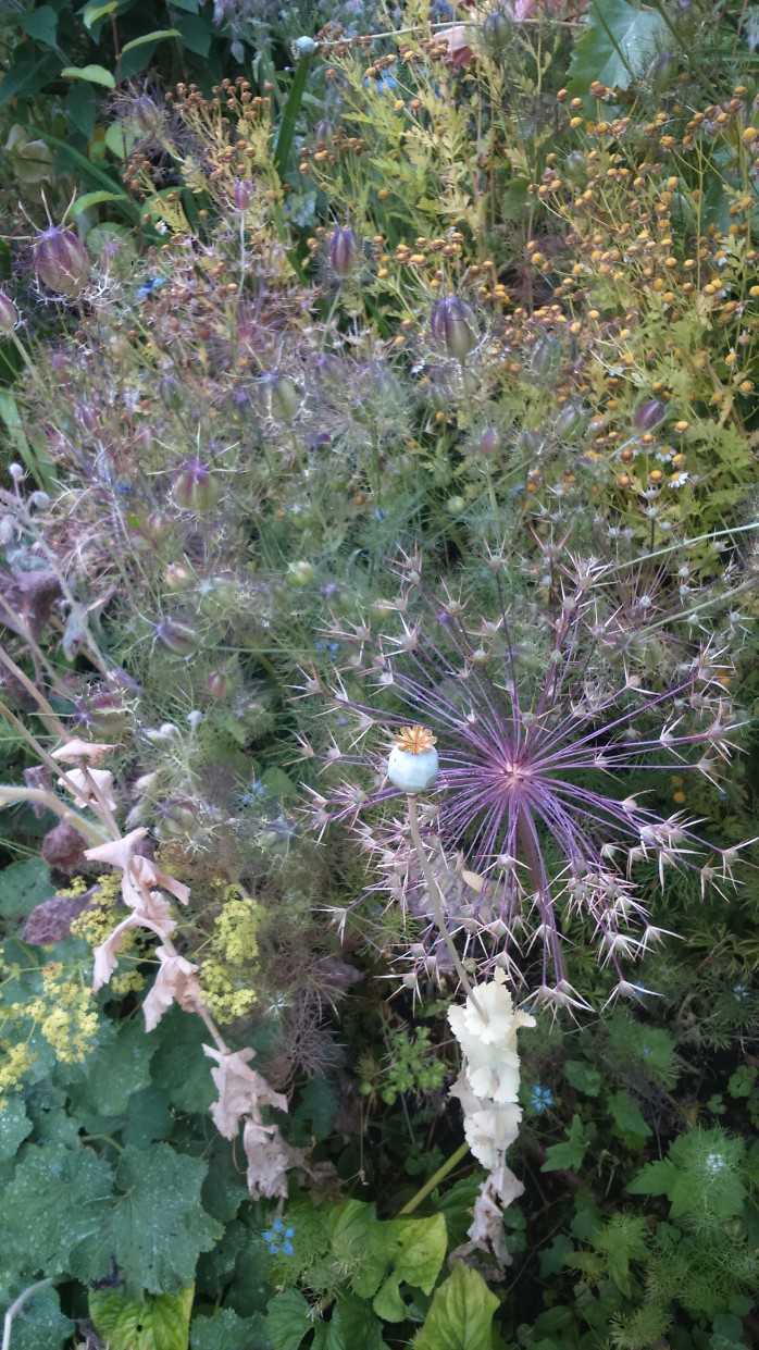 The sun shows up all manner of miniscule details: a strand, a filament of spider’s web stuck to a bramble new-leaf which is coexisting with the old ones on the same stem. There are also aged twigs, dry leaves, spent old man’s beard alongside the new blackthorn flowers and buds. We are all together in this.