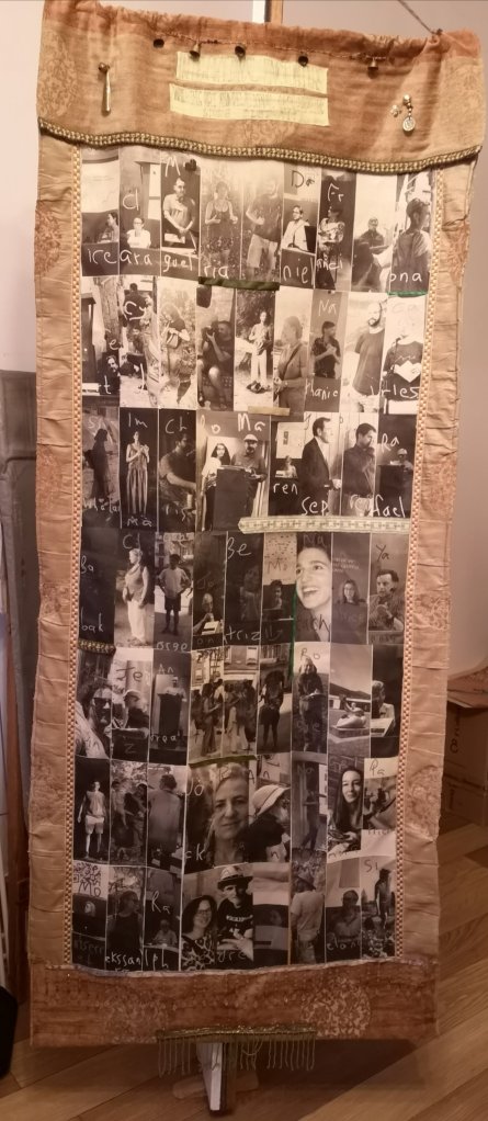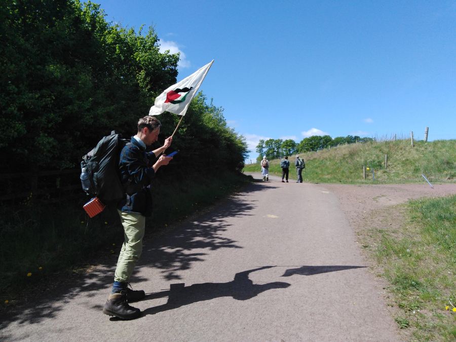 I walked the final day with Tom Jeffreys and others in solidarity with Palestinian families, and made a flag featuring a quote from Jumana Emil Abboud.