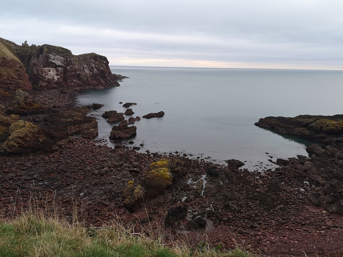 At Cove, there are caves in the red rock and stacks to rival Orkney’s. Striated rock comes down into the water. I spied a single cormorant on a rock with another swimming towards it out at sea. A solitary, brown, fluffy caterpillar was at my feet.