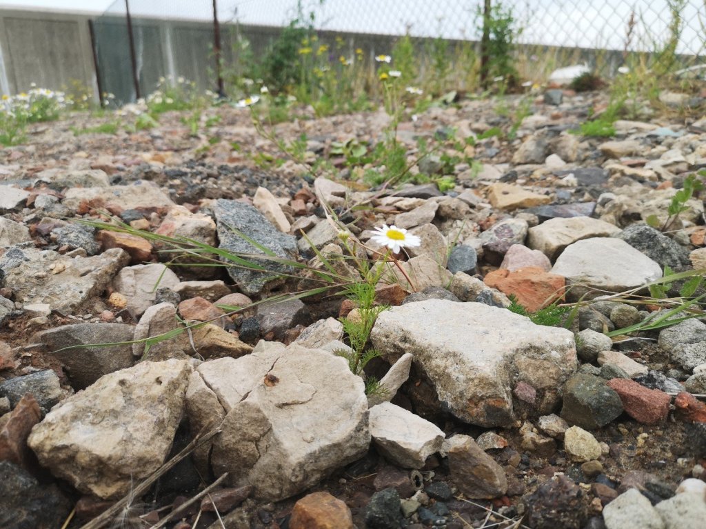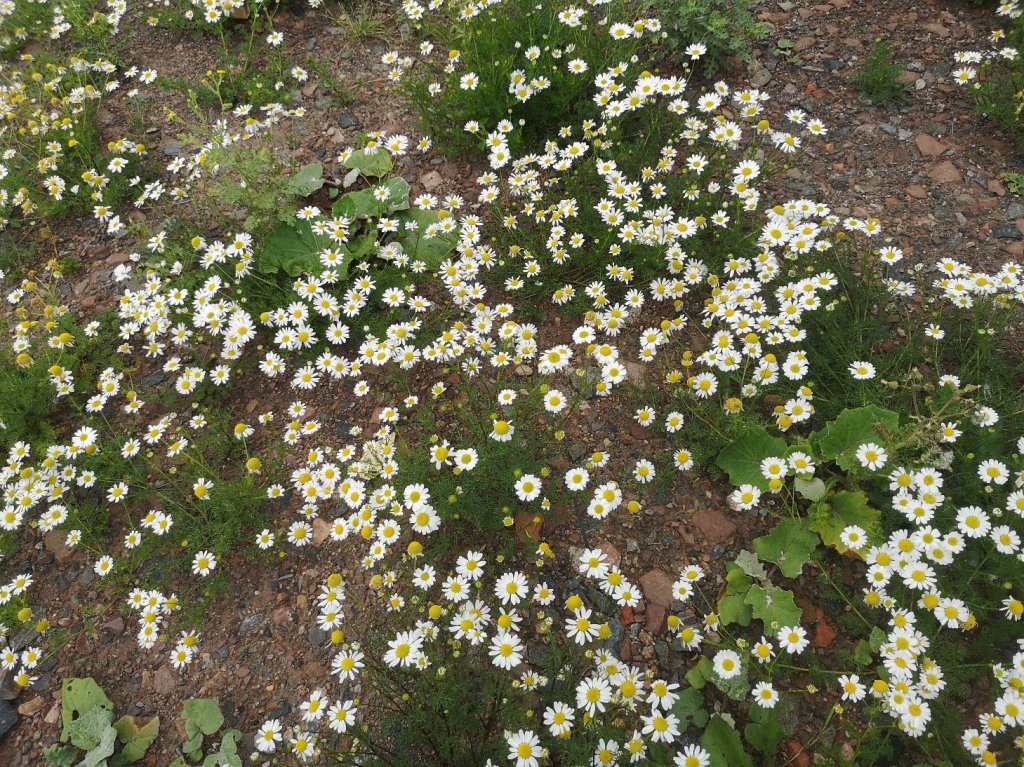(Beware the thistles! And try not to crush the chamomile, although if you arrive before midday you can gingerly remove a handful of flowers for a tisane which will taste quite delicious compared to the tea bags you can get in Lidl. The plants will simply send out more blooms in response, and their days are numbered).