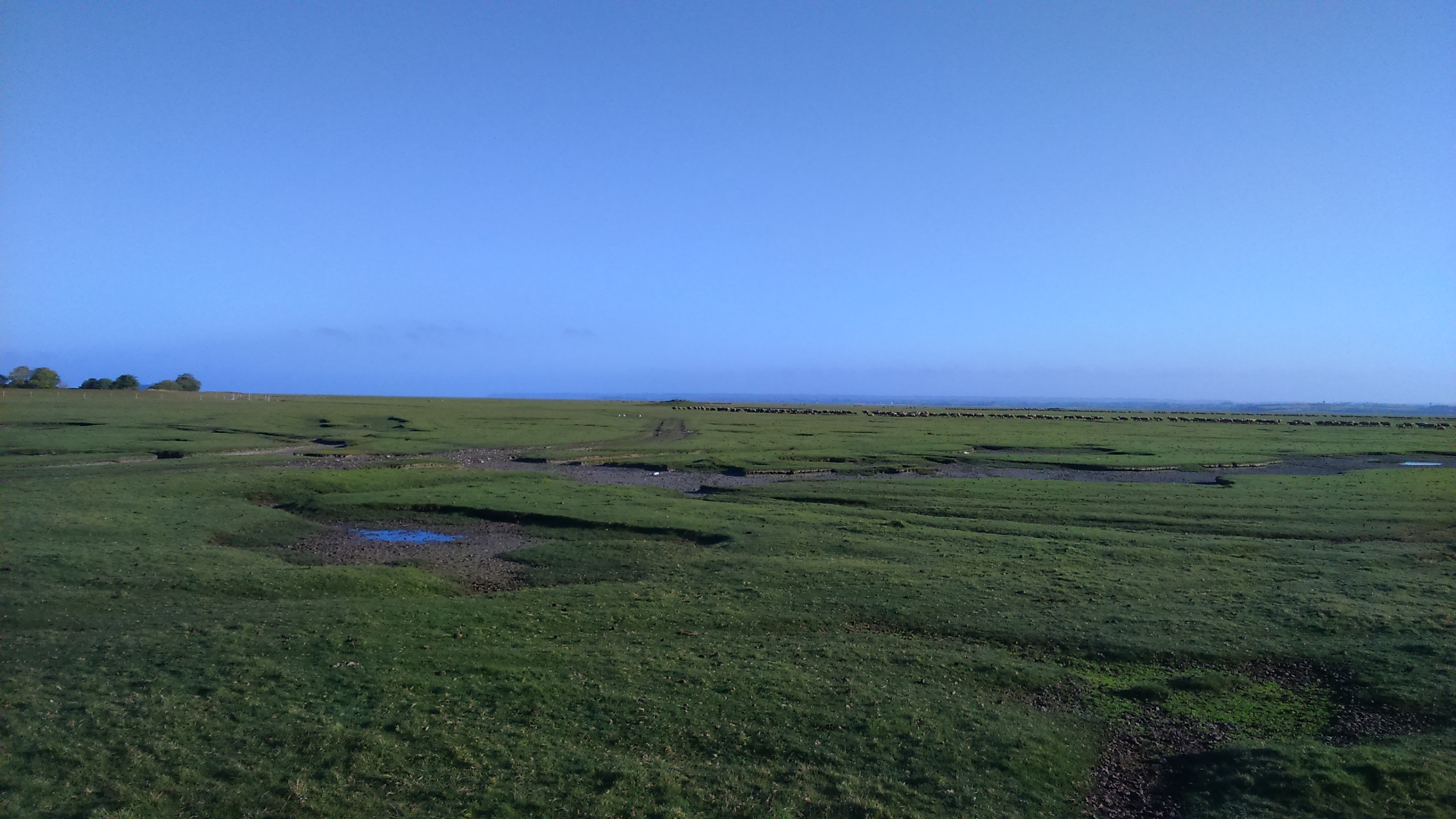 Mont Saint-Michel is clear in the distance. My human eye (rather than the camera) can see the shuttle buses, like black and white caterpillars on the horizon, the place I walked along 14 hours earlier. They are in contrast to the luminous spring green of the fields.