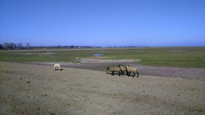 What a racket! Sheep: many, one after the other, having been let out (perhaps after the winter?) moving slowly in single file across the field, over the grey clay. A female and her lamb were leading, with not a human in sight, and yet they were reminiscent of the group of us who crossed the bay yesterday, though we did follow a guide.