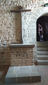 When I arrived, there were long queues for the foot fountains for washing so I did not bother, and I had to pay to get into the toilet. Then the woman in the tourist office told me I wouldn’t be allowed into the Abbey with my backpack, due to terrorist threats. I reckoned differently, not having come all this way on foot, with this weight, only to be refused admittance. Barefoot, I continued my winding way up the back street to avoid the crowds.