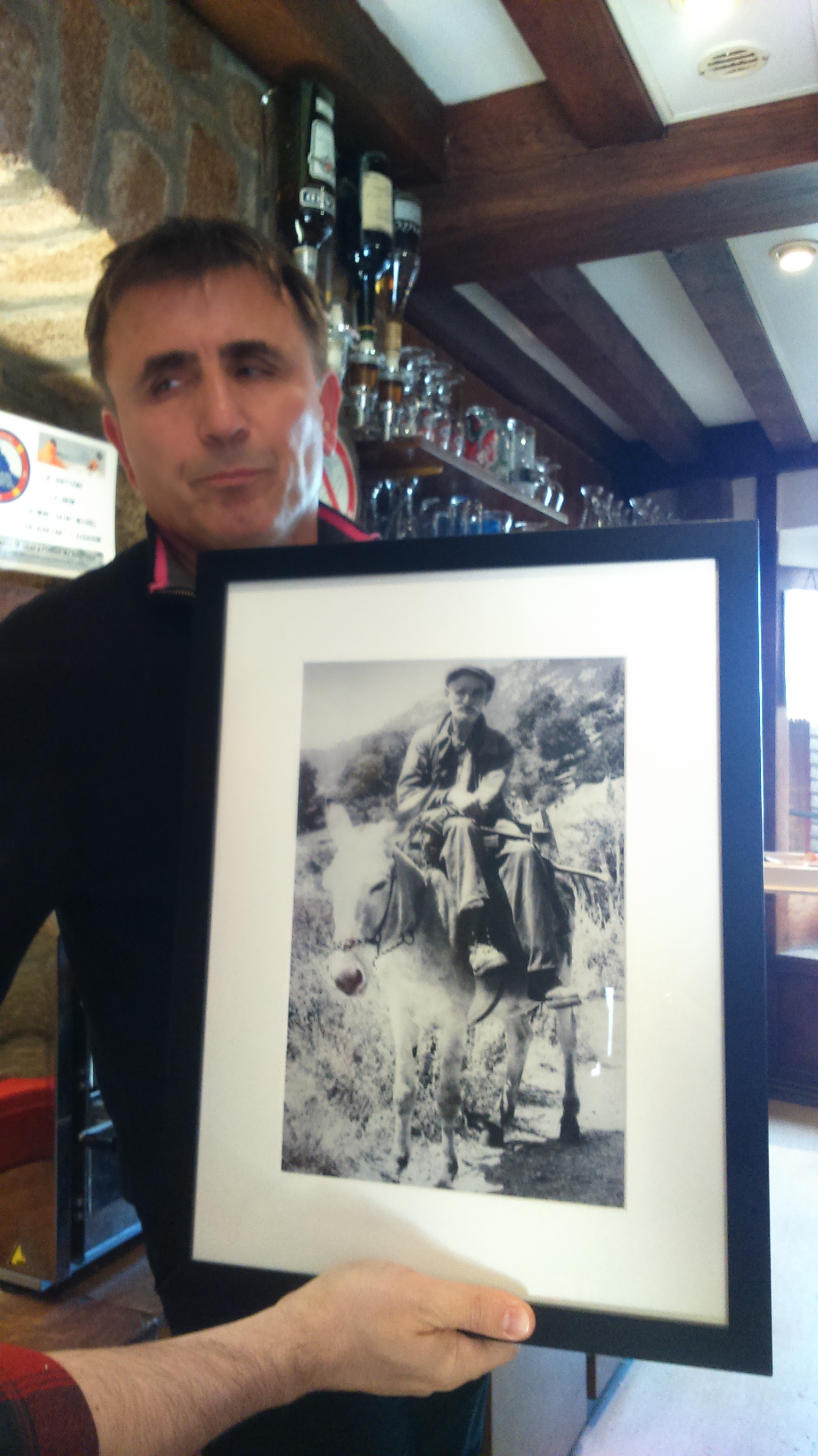 It was sumptuously hot once outside again, and I wound my way down, between souvenir shops and restaurants, sampling a small red wine to warm my cockles. There I spied a picture of a man on a donkey, the grandfather of the owner, held up by his son.