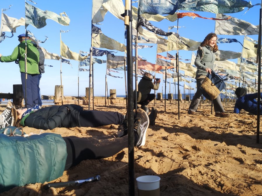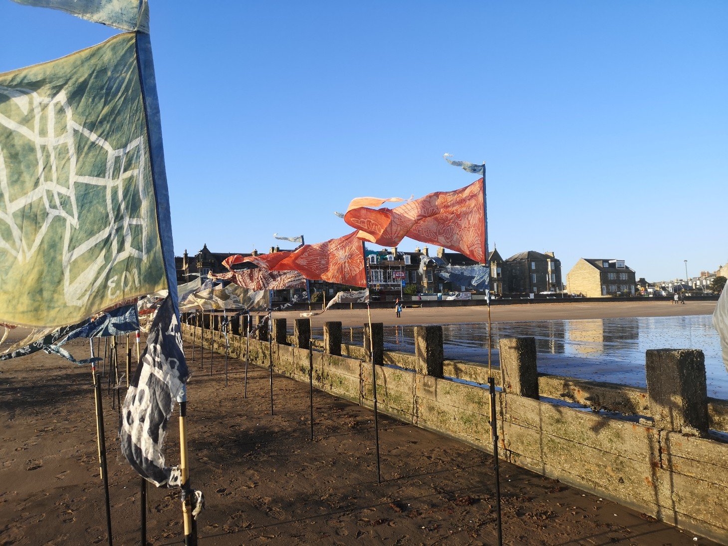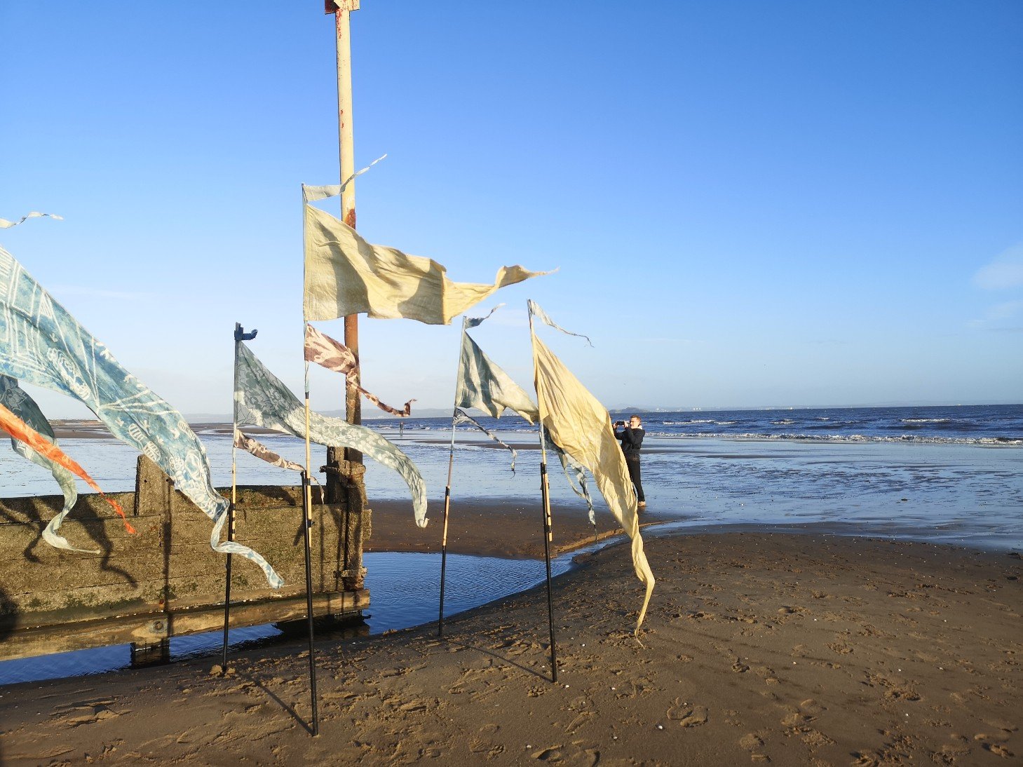 These flags represent the dreams of the people of Eastern England for the future. Like urgent messages to us here on the east coast of Scotland, they tell of the vulnerability of our coastlines as sea levels rise. Moving, literally and emotionally, they are fragile, though steady, ephemeral but made of real stuff. They flutter and flap in the wind, prompting questions, ‘What’s blowing away? What are we losing?’