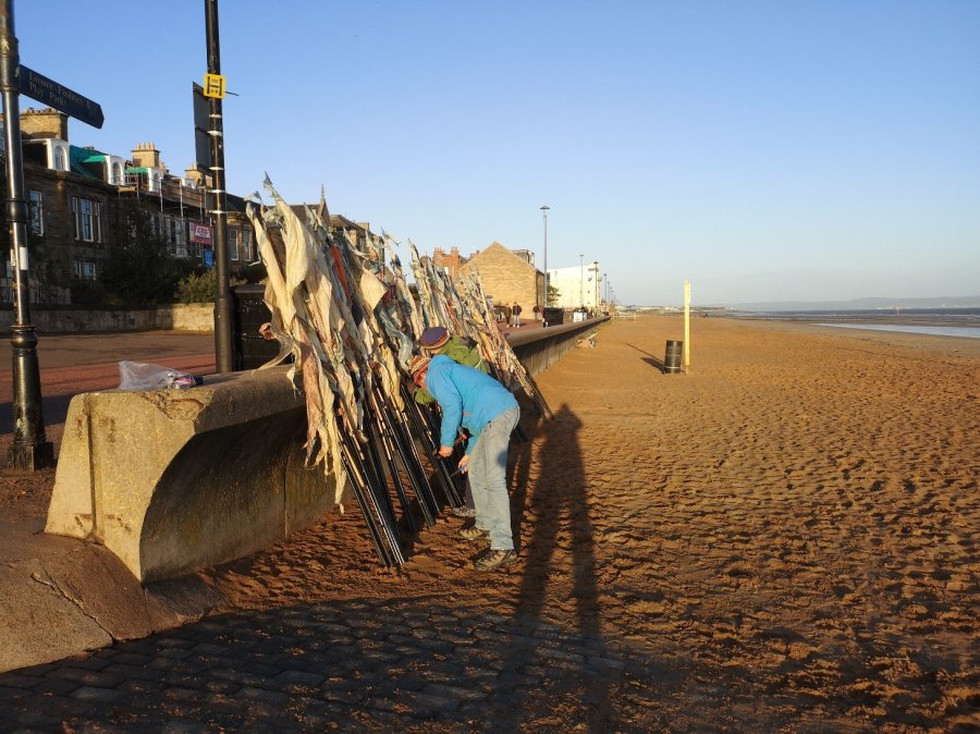 The flags were initially positioned in lines parallel to the Portobello breakwater, but as the sea came in, volunteers hurriedly moved them, re-sinking them in the sand higher up the beach and creating a tide of people and artworks rushing away from the approaching waters.