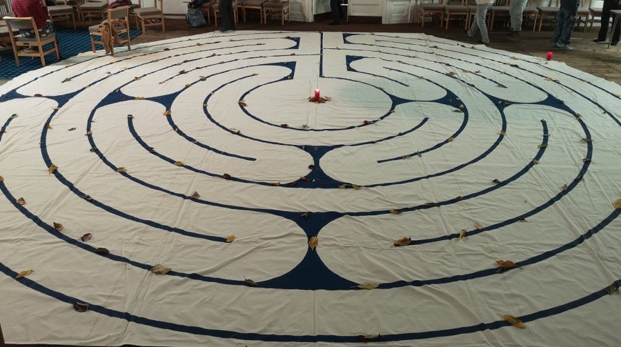 Around the labyrinth I slowly walked, doubling back on myself, at once facing centre, then away from it, moving nearer, then seeming to be distanced. The narrow channel between the lines gave a sense of safety and the golden leaves which were scattered around, encapsulated the passing of the year. Eventually the tears dried up and there was something like peace, or at least calm as I continued. The sun was shining and it threw shadows across us and the room. I was conscious of passing shoulder-to-shoulder with friends on a similar journey to mine, others with wet cheeks. Someone walked with her arms crossed over her chest, another with his hands cupped in front of him, a woman with arms raised up, palms to the ceiling. In this way, we almost-met, though we didn’t stare or speak. We were all in it together.