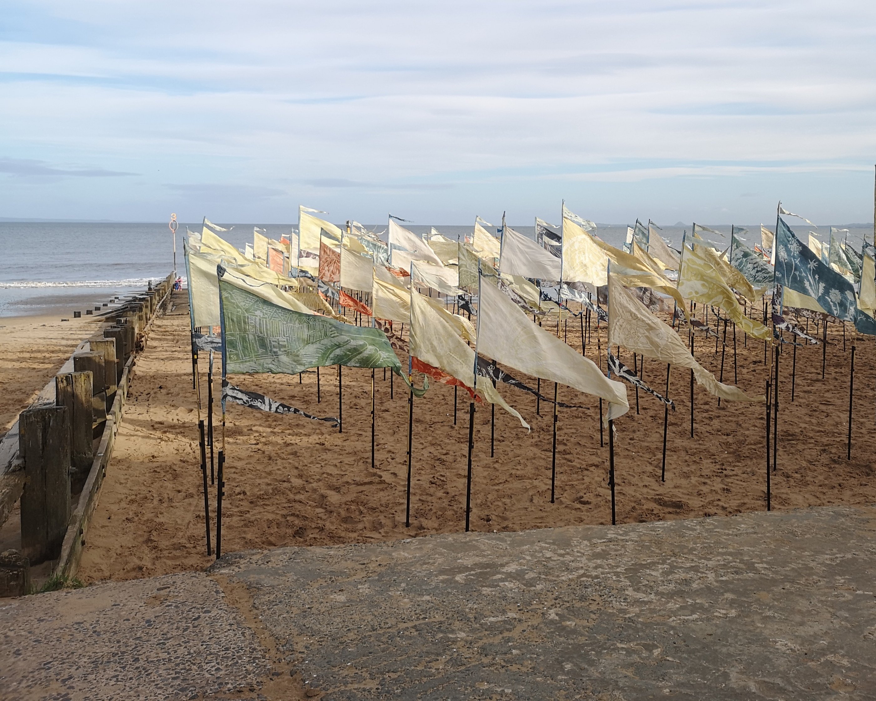 This art installation is made up of 500 silk flags flying from poles which were planted on the beach, each representing a mile of the Essex coastline. A new pennant was created for each of these miles by Kinetika artists in response to photos or other images which were produced by people living in this edge-country, people who are witnessing the disintegration of the ground on which their houses are situated.