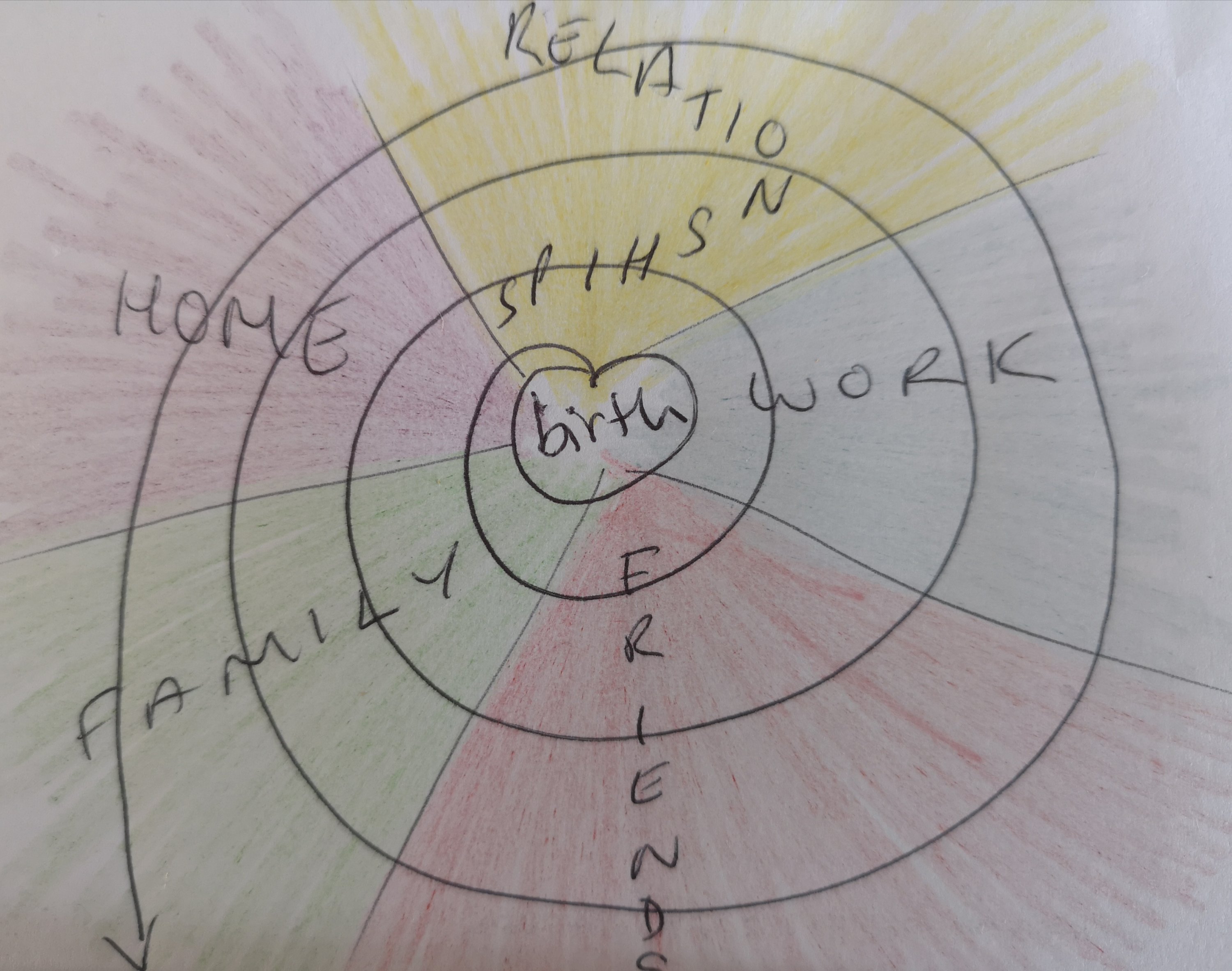 I hadn’t seen it earlier, even though I am collecting one per day (see my first blog of this series) and so it was somehow special to find it at the moment that had I been ‘sent’ back. I picked it up, took a deep breath, turned around and carried it with me as I re-negotiated the labyrinth. Though I walked faster the second time, there was another onslaught of grief. It reminded me that we walk round our lives, spiralling outwards from our birth, but coming back through key elements of it. We are given the chance to go through stages again with our accumulated wisdom. I hoped I was wiser after the event.