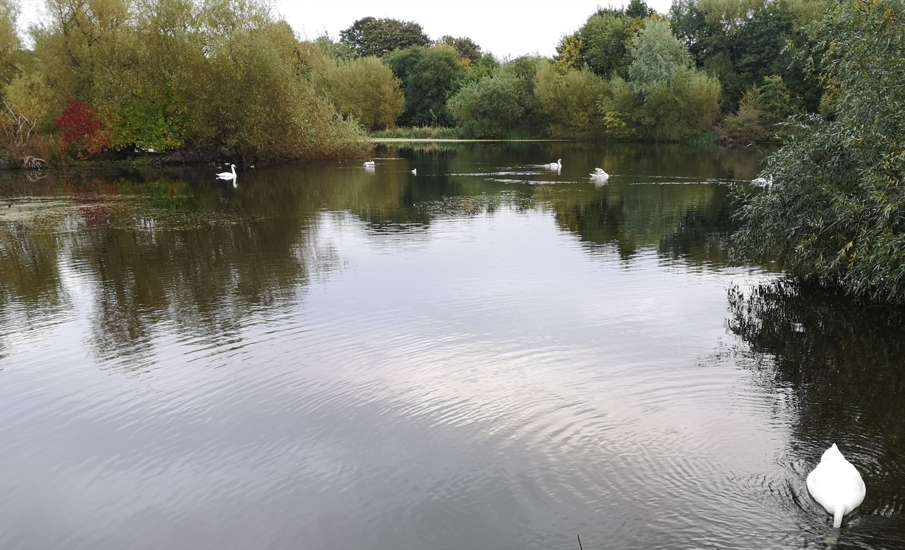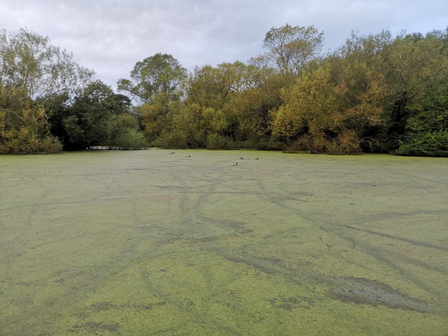No, and neither is the water stagnant! The Friends of Figgate Park facebook page states that the covering is Duckweed, a fast growing, thin-layer of plants which grows in nutrient-rich water (much like algae does), especially in areas where lots of bread may be thrown in (despite the signs, duck-feeders still do this). It is not harmful, there are even some benefits: Waterfowl like Mallard Ducks and Moorhens absolutely love it, and the Mute Swans have been eating it too. As it’s such a thin layer it doesn’t impede them moving around (notice the trails in the photo above), can shelter small fish, and is possibly one of the reasons the latter seemed to do so well last year.