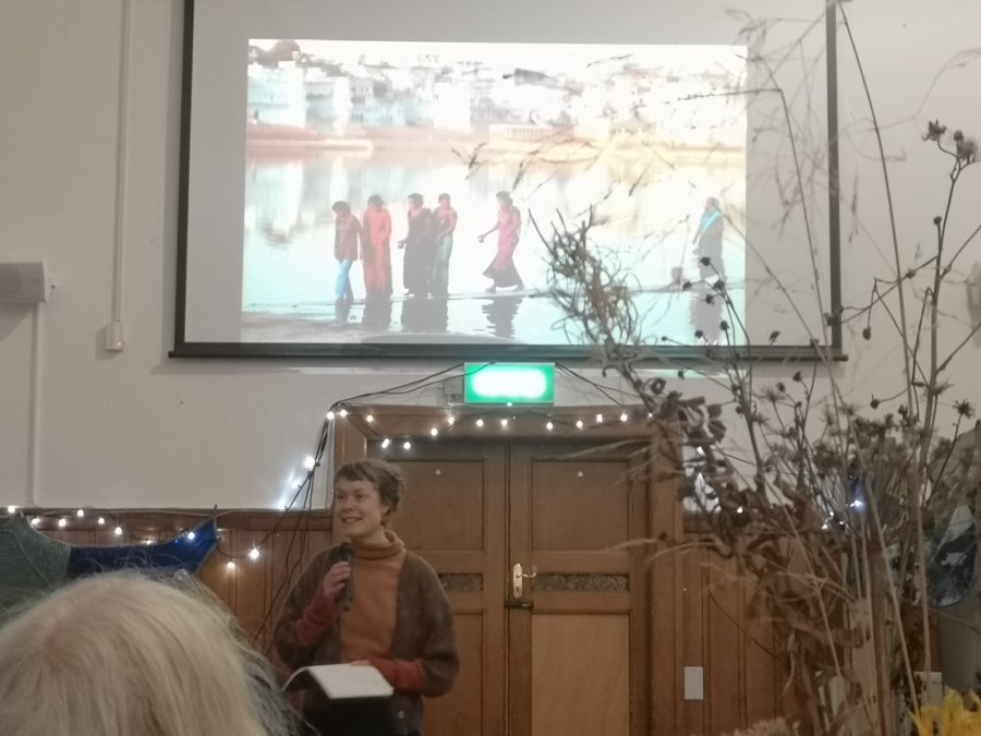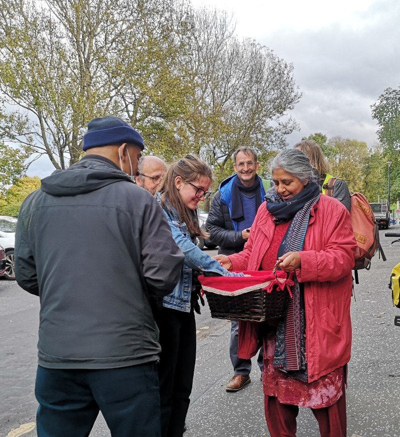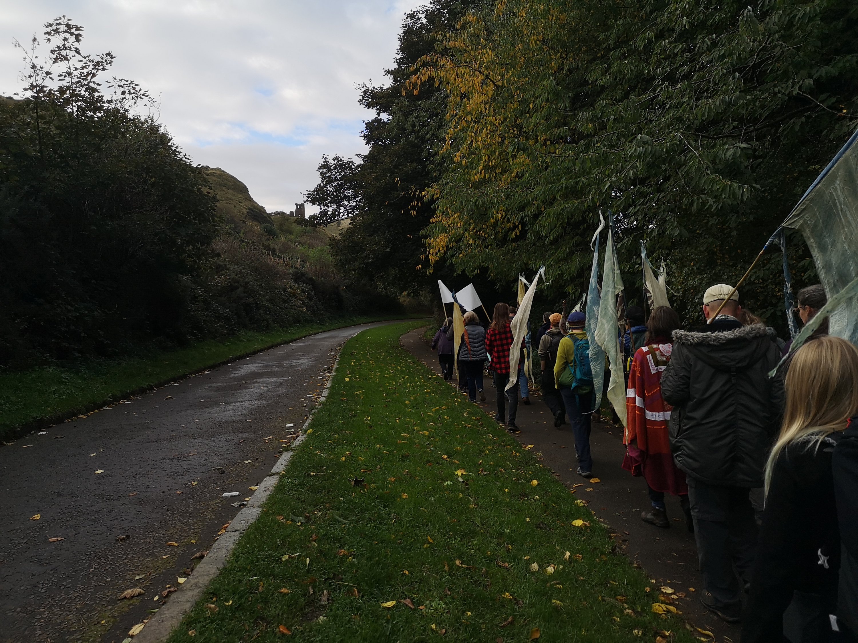 Pilgrimage is often a walk which moves, like ours, across long distances, however that doesn’t have to be the case. Indeed, there was an increase in the number of stay-at-home pilgrimages developed during the Covid19 lockdowns – from walking around your garden to following a route online. Our afternoon one is organised by the Edinburgh Interfaith Community and takes us through the city – from New College where we listen to speeches from a Pagan celebrant (“To protect and restore the world’s biodiversity”), Ani Rinchen from the Kagyu Samye Ling Tibetan Buddhist community (“To continue to take responsibility for our actions. We will solve the problems, so we must look after our minds so that we can act wisely, and wisely elect our leaders”), and Jewish community leaders, among others, to visit the Baha’i community, the HinduMandir (“We are all the same, we all have the same nose, two eyes and a mouth” Neela Joshi), and various venues, ending at the Sikh Guru Nanak Gurdwara (“No one group, no one faith can do it alone.”) where we are treated so attentively and fed a delicious langar, a community meal which is prepared daily for anyone who needs it.