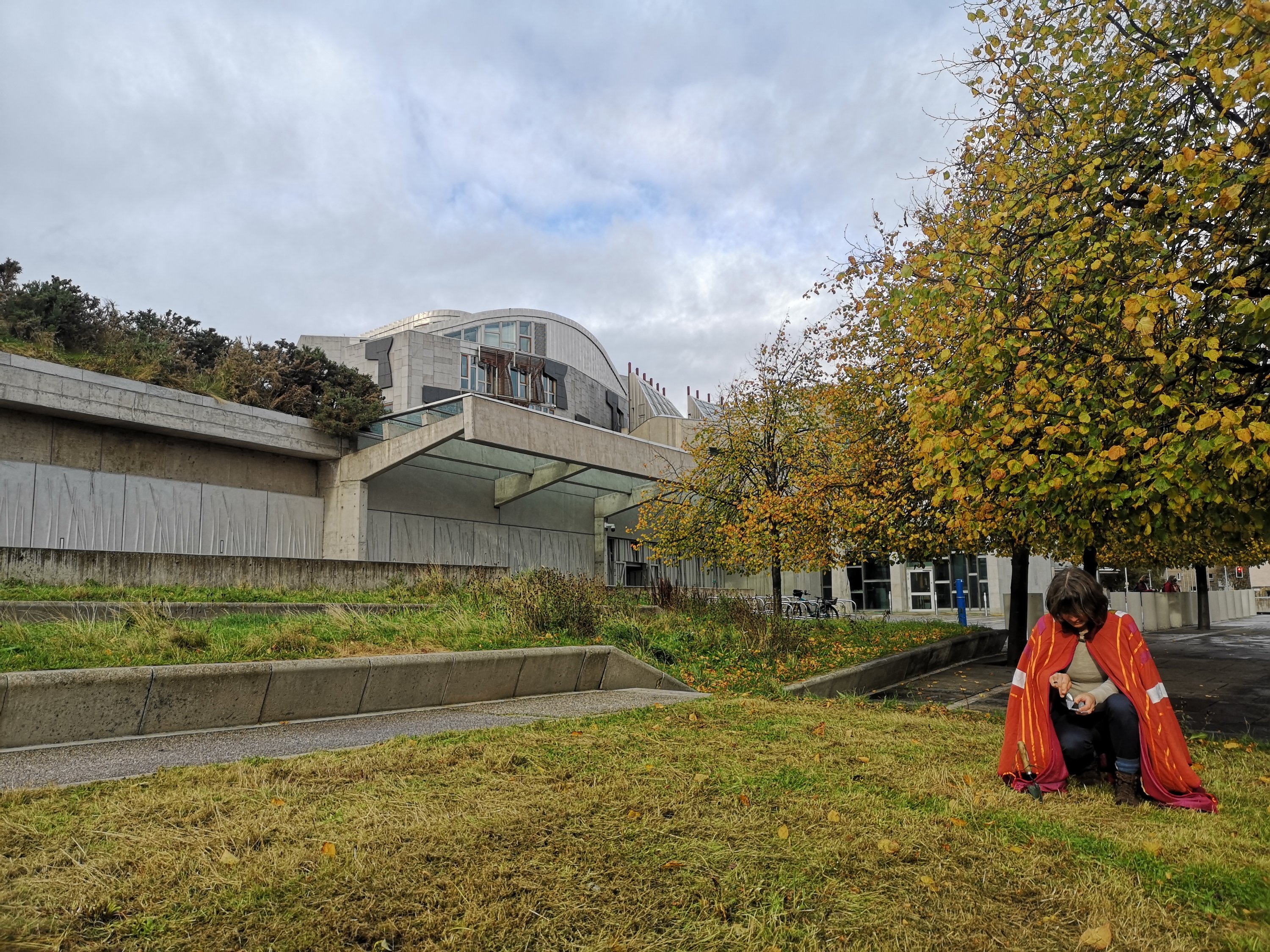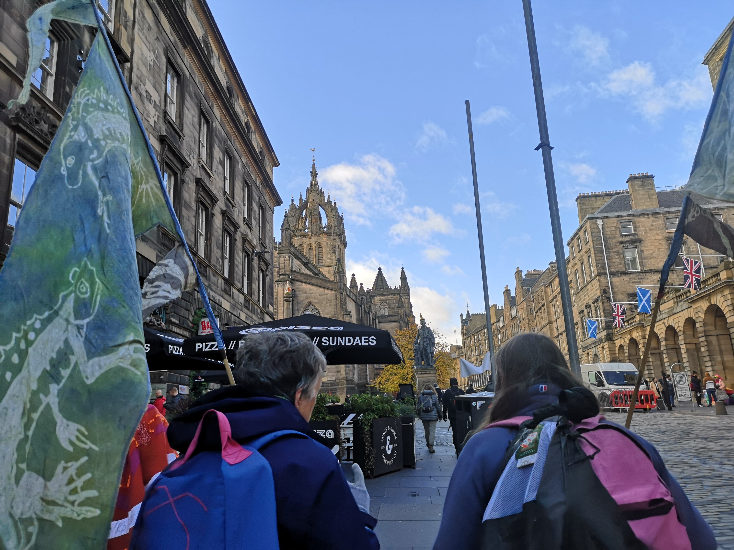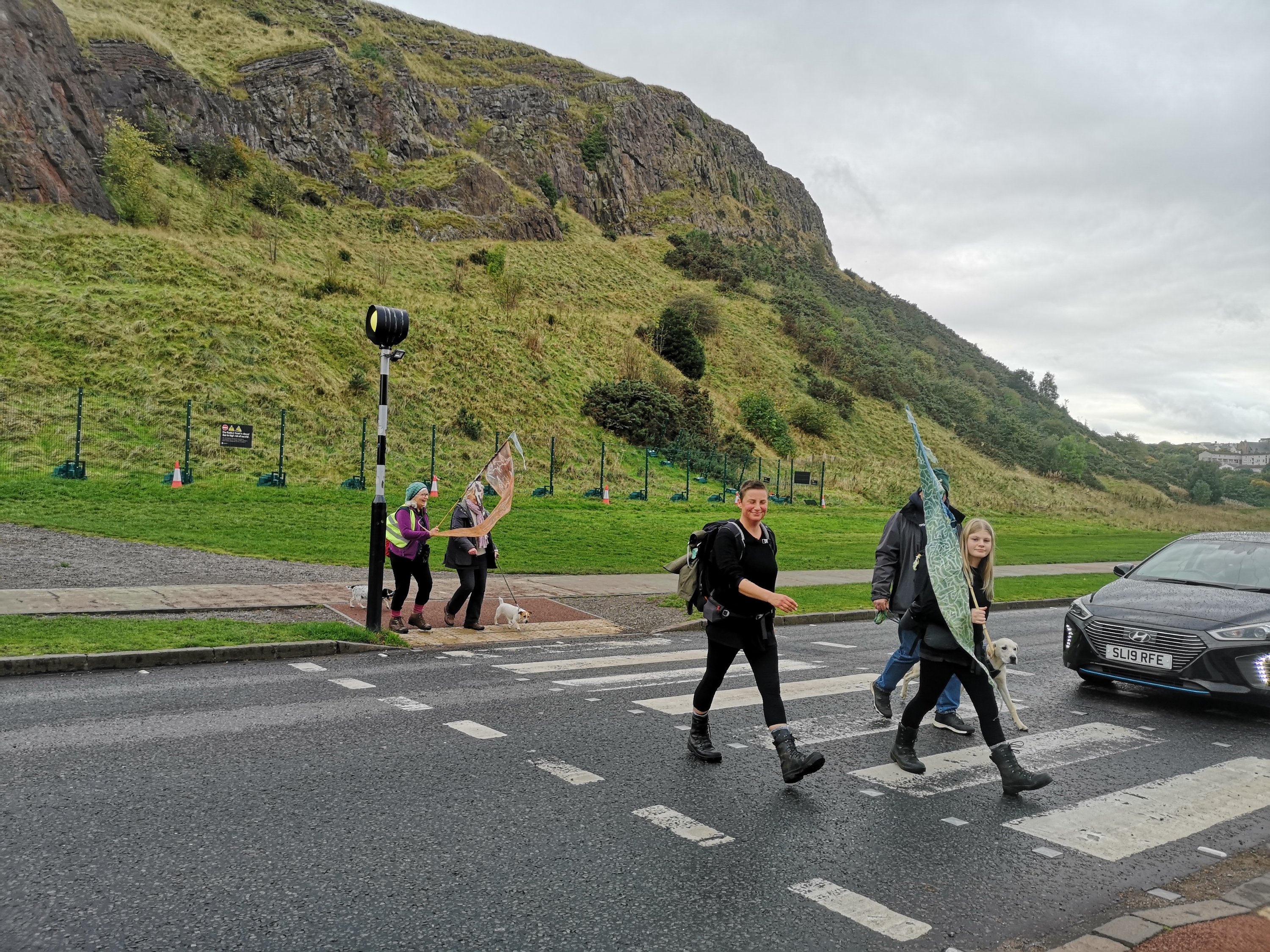 Heading down towards the St Margaret’s Loch, Holyrood Park, Edinburgh – overcastOnce again we stop the traffic – apt considering that we are walking to the COP26 climate conference in Glasgow where it is hoped (there’s that word again!) that world leaders and business owners will determine to reduce carbon levelsNatalie Taylor, John Muir Fellow, artist and today’s wearer of the Keeper of the Soil. She’s wearing the cape she made with the help of other stitchers in DunbarHeading up the Royal Mile with St Giles on the horizon, Edinburgh