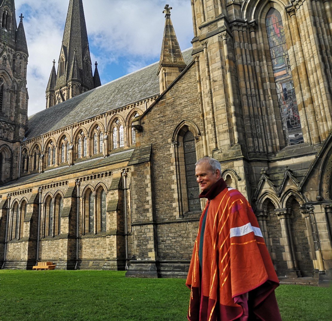 John Conway, Provost of St Mary’s Cathedral, Palmerston Place, Edinburgh who is granted the cape during the soil ceremony which takes place when we arrive The spectacular Gothic arch of the main entrance to St Mary’s Cathedral, our destination