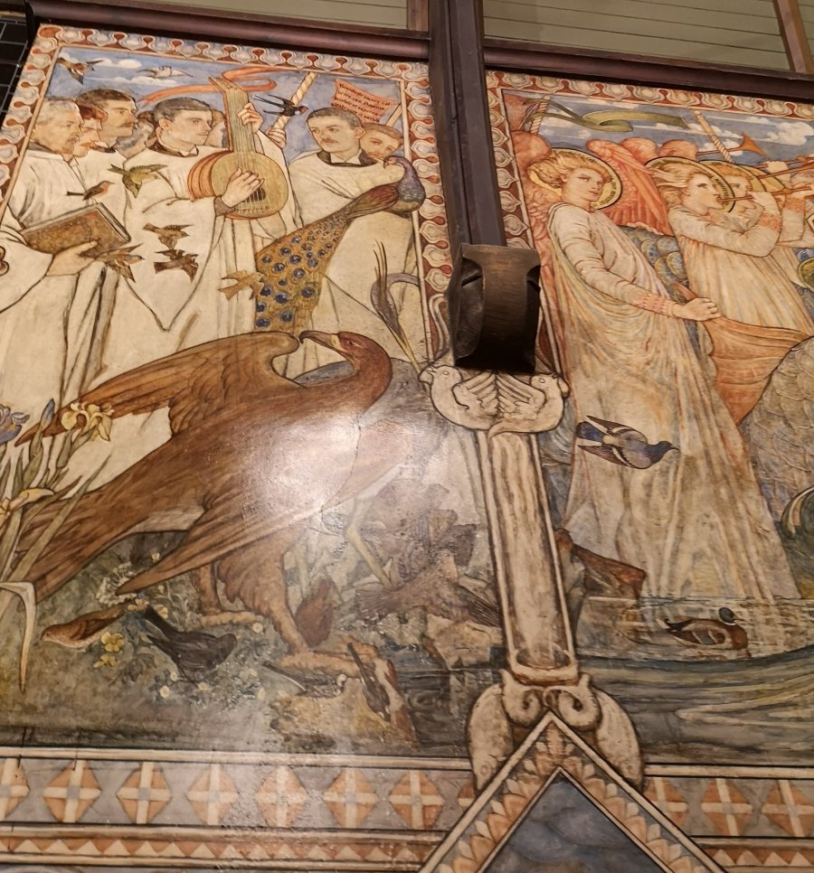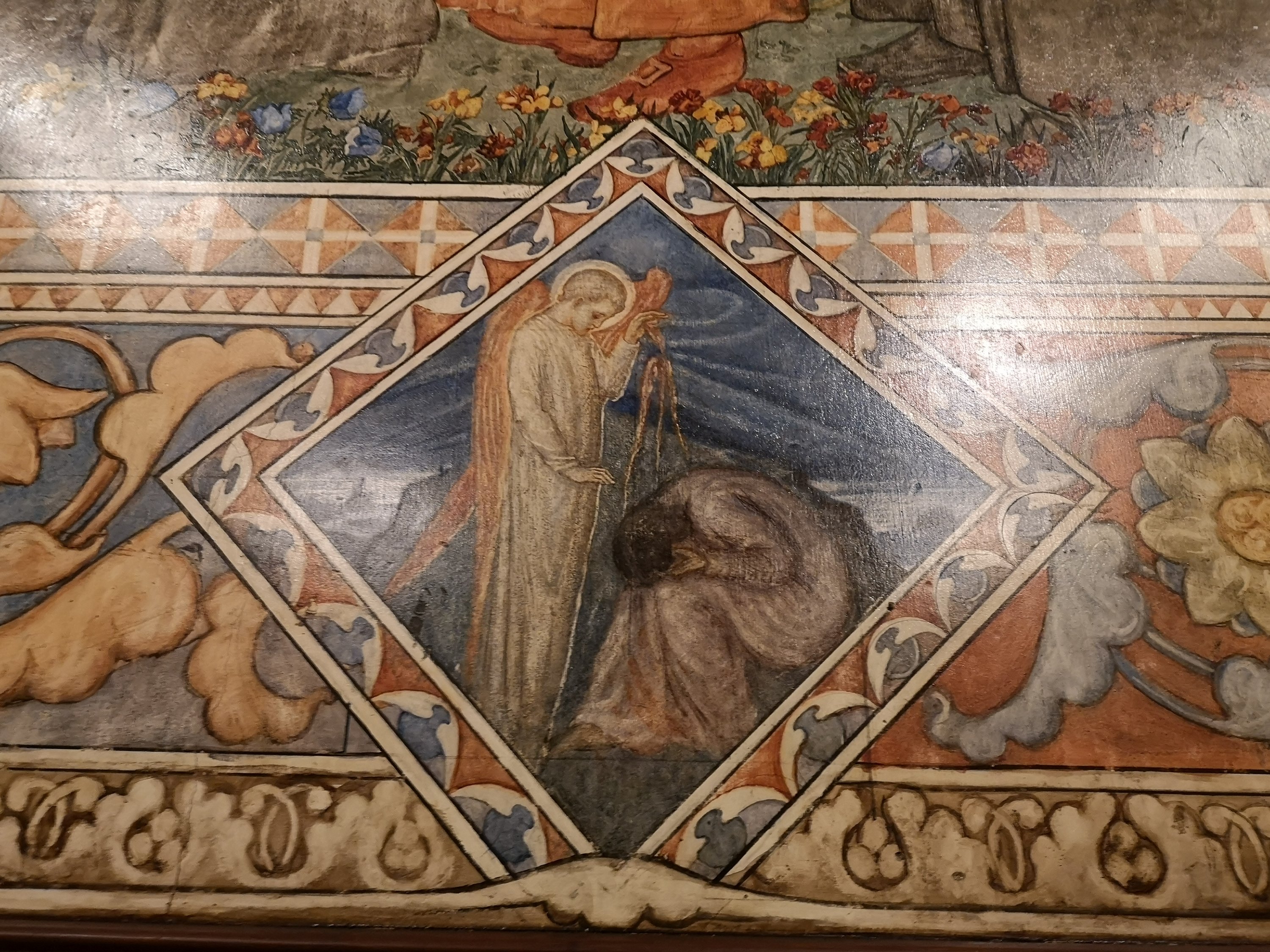 I know of the church at Bellevue (Mansfield Place) which is decorated with Traquair’s murals dating from the 1890s, and have seen exhibitions of her work at the Gallery of Modern Art, but the Choir is a hidden gem. It is a working space, the Provost proudly tells us, used for daily practice and so not ordinarily open to the public. Here is a procession of creation, of angels and church men interspersed with famous writers, artists and politicians of the artist’s time. Like our motley crew of pilgrims, they traverse the walls of the small room alongside birds and plants, and the work aims to take inspiration from sorrow, for the renewal of spirit.