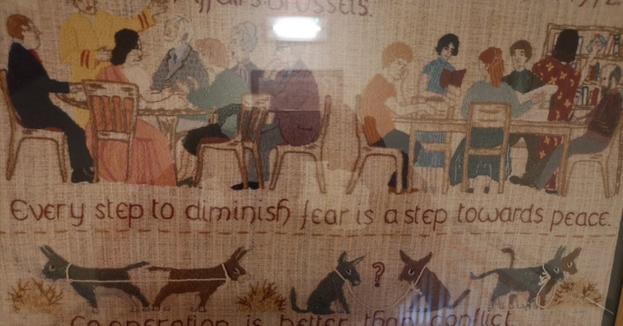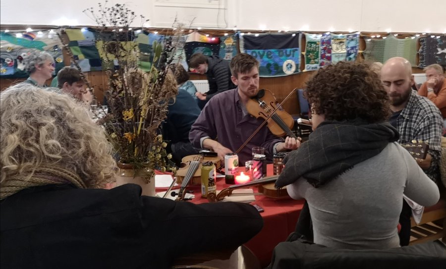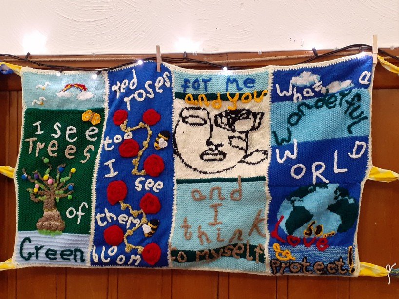 There is an afternoon of workshops including flag making with Ali Pretty of Kinetika (see above), and in the evening, a celebratory ceilidh. It isn’t possible to dance (what? no dancing at a ceilidh!) which is sad, but we are regaled with poetry, stories, a slide show, music, and eat fantastic food (thanks to Robin and co of the Ceilidh Collective). We are also shown the choir’s practice room which has paintings by Phoebe Anna Traquair.