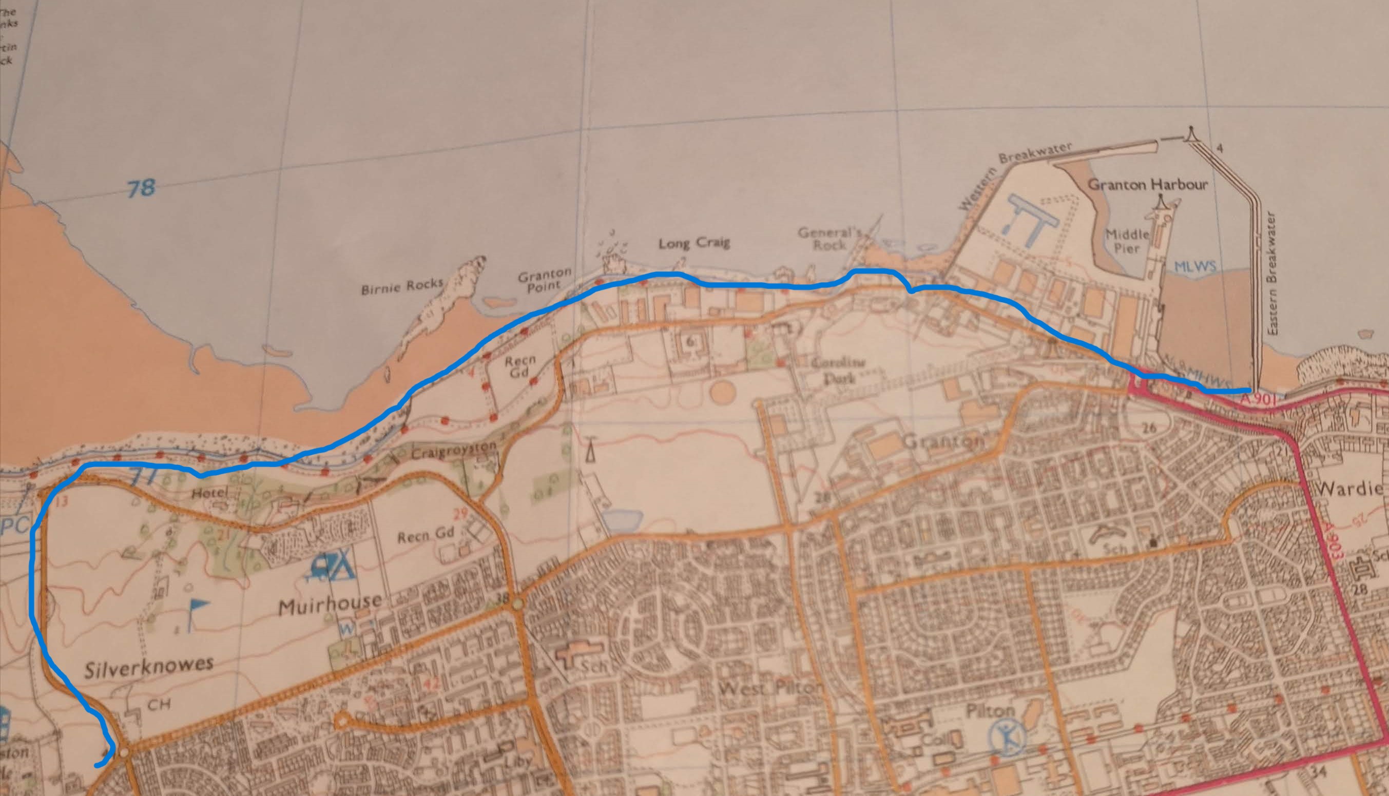 Starting at the end of the Eastern Breakwater at Granton Harbour and walking along through the industrial area between Granton Square and the end of the Silverknowes walkway, continuing along the front, then turning inland to Lauriston Farm.
