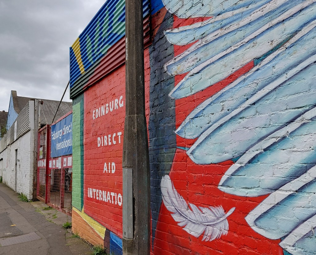 16A West Harbour Road on the wall of Edinburgh Direct Aid (dedicated to providing humanitarian aid to people suffering as a result of man-made or natural disasters. EDA’s current main projects are in Ukraine, Gaza and Lebanon.) The City of Edinburgh Council supported the artists who created the work through their Diversity and Inclusion Fund.
