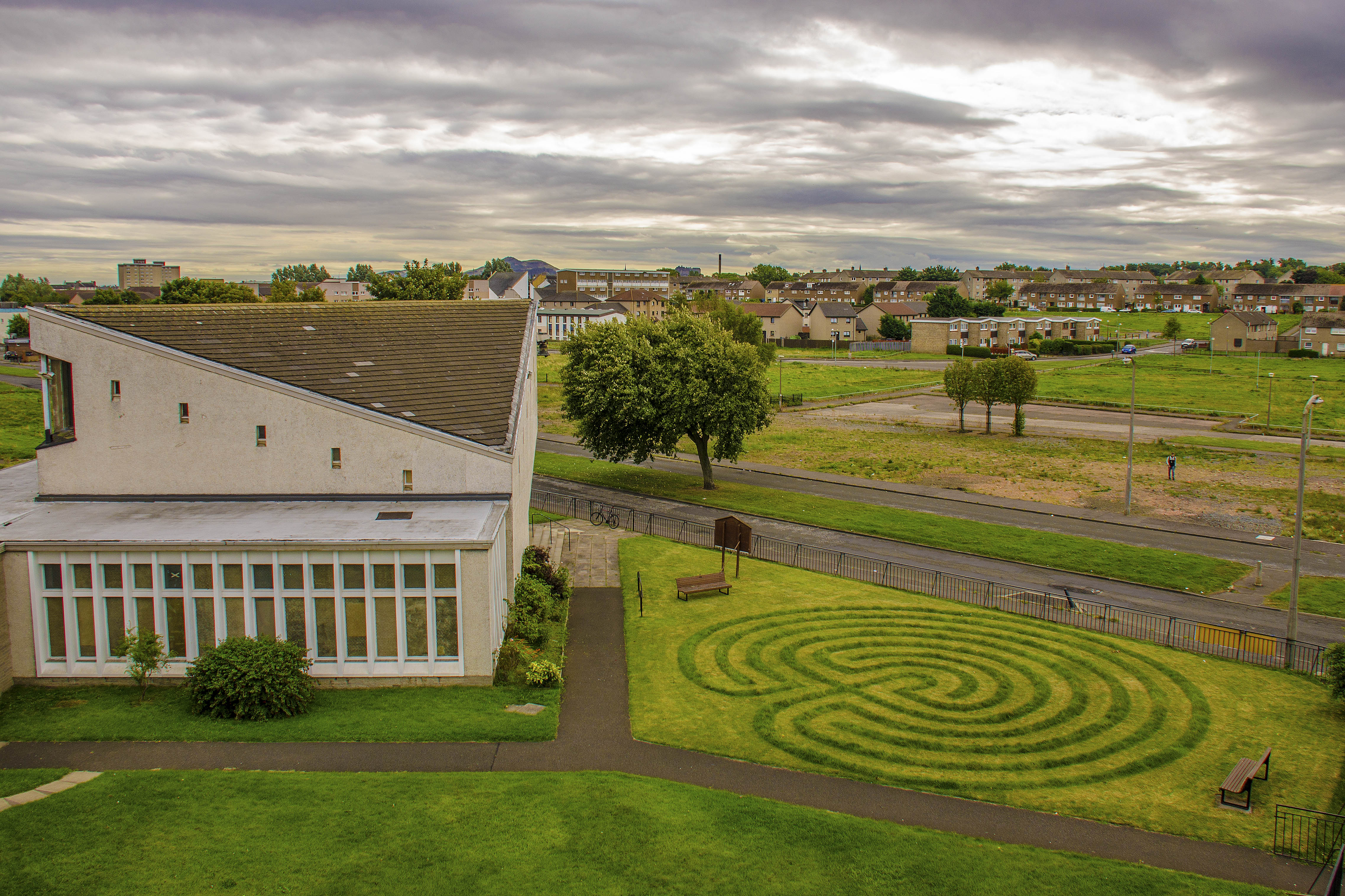 A Cretan labyrinth in the grounds of Pennywell Kirk (Old Kirk and Muirhouse Parish Church) constructed by artist Natalie Taylor in 2016. It takes approximately 15 minutes to walk slowly into the centre. Commissioned by Centipede Project. Address: 42 Pennywell Gardens, Muirhouse, Edinburgh EH4 4PE.